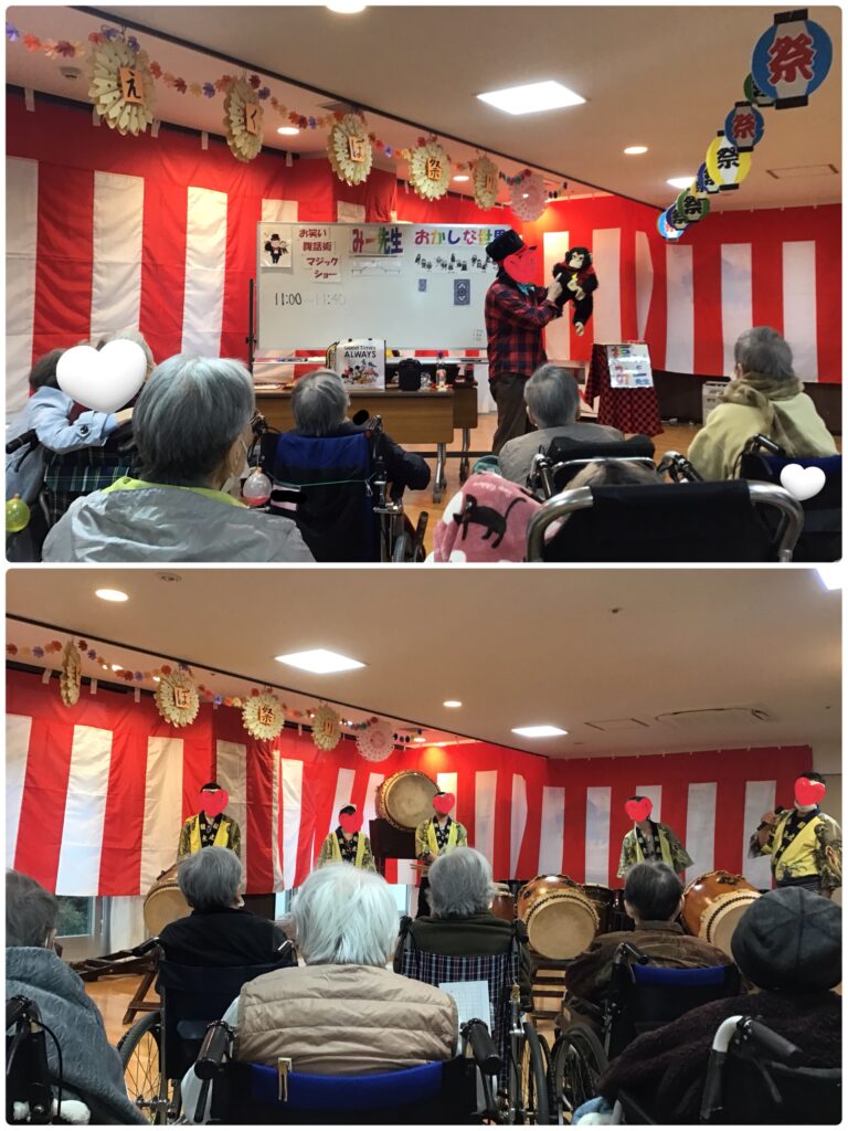 また外部ボランティアでは、みー先生による腹話術マジックショーや越谷龍虎太鼓和太鼓”舞”の皆様による力強い演奏を披露していただき、感動され涙ぐまれるご入居者様がおりました。